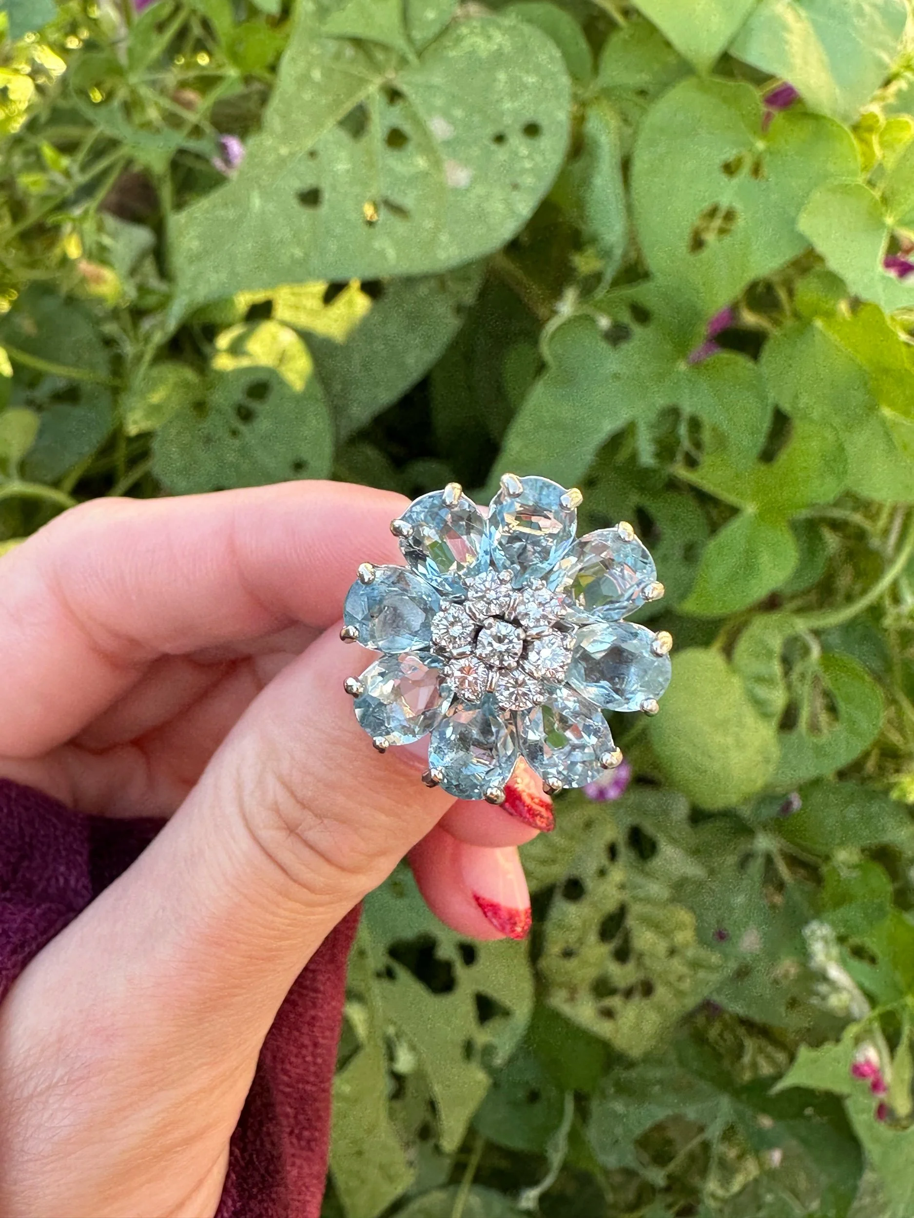 This exquisite ring is super sparkly, bold, and timeless. The natural aquamarine shines with ocean-blue brilliance, enhanced perfectly by the shimmer of genuine diamonds. It’s a truly heirloom-quality piece — sophisticated enough for fine occasions yet strong enough for a lifetime of wear.