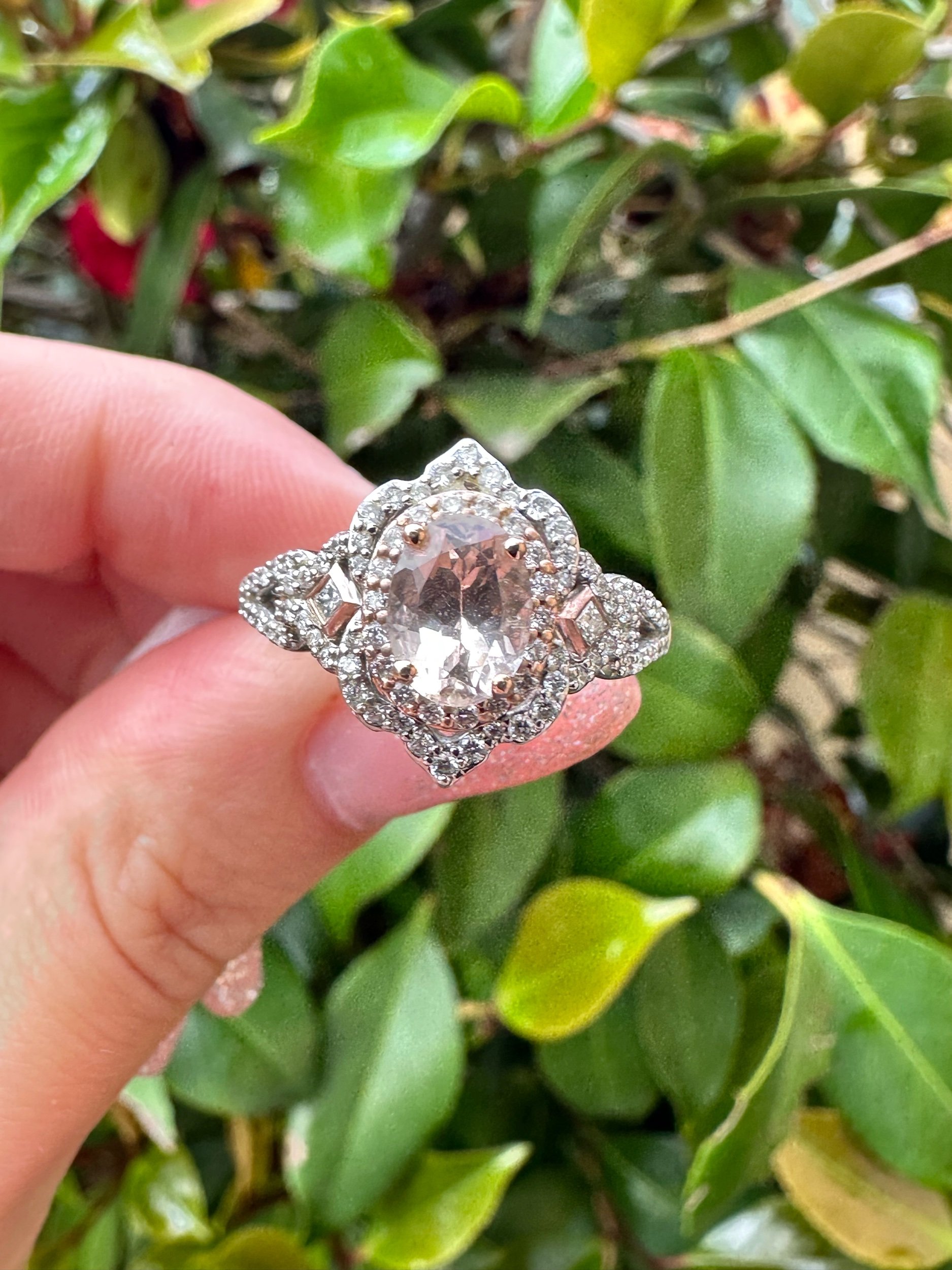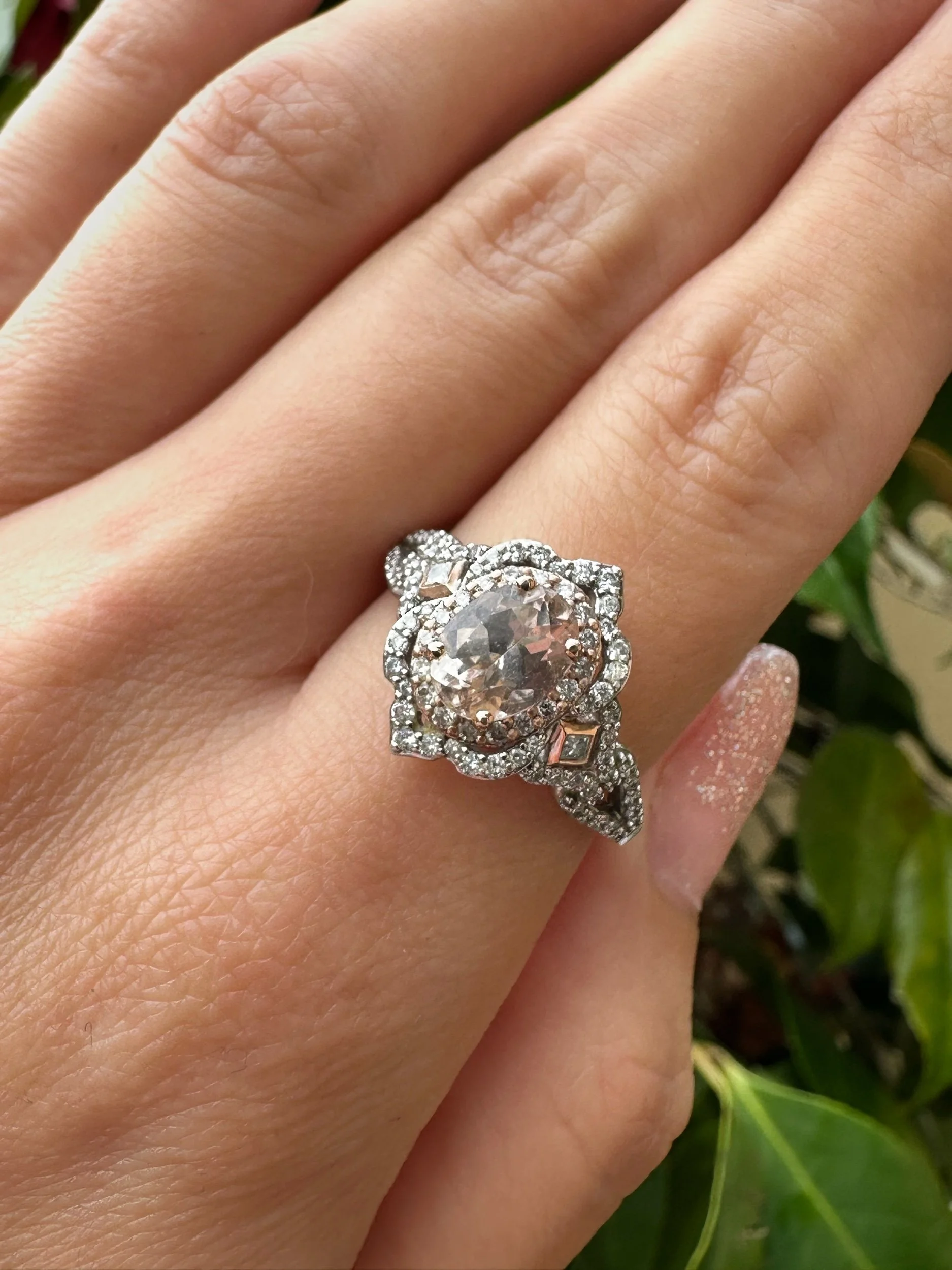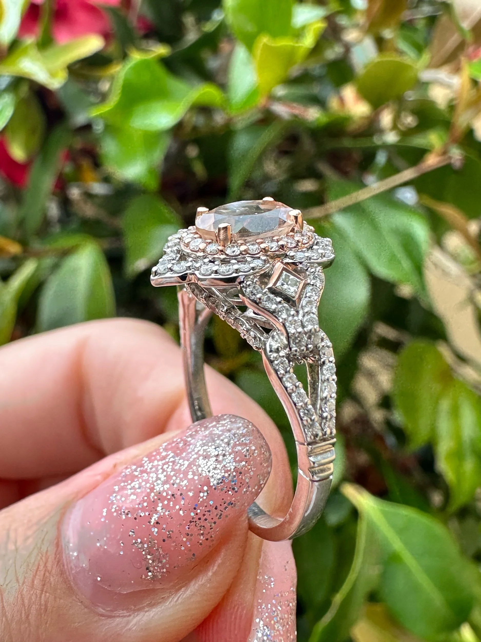 14 karat white gold and rose gold stunning morganite and diamond ring