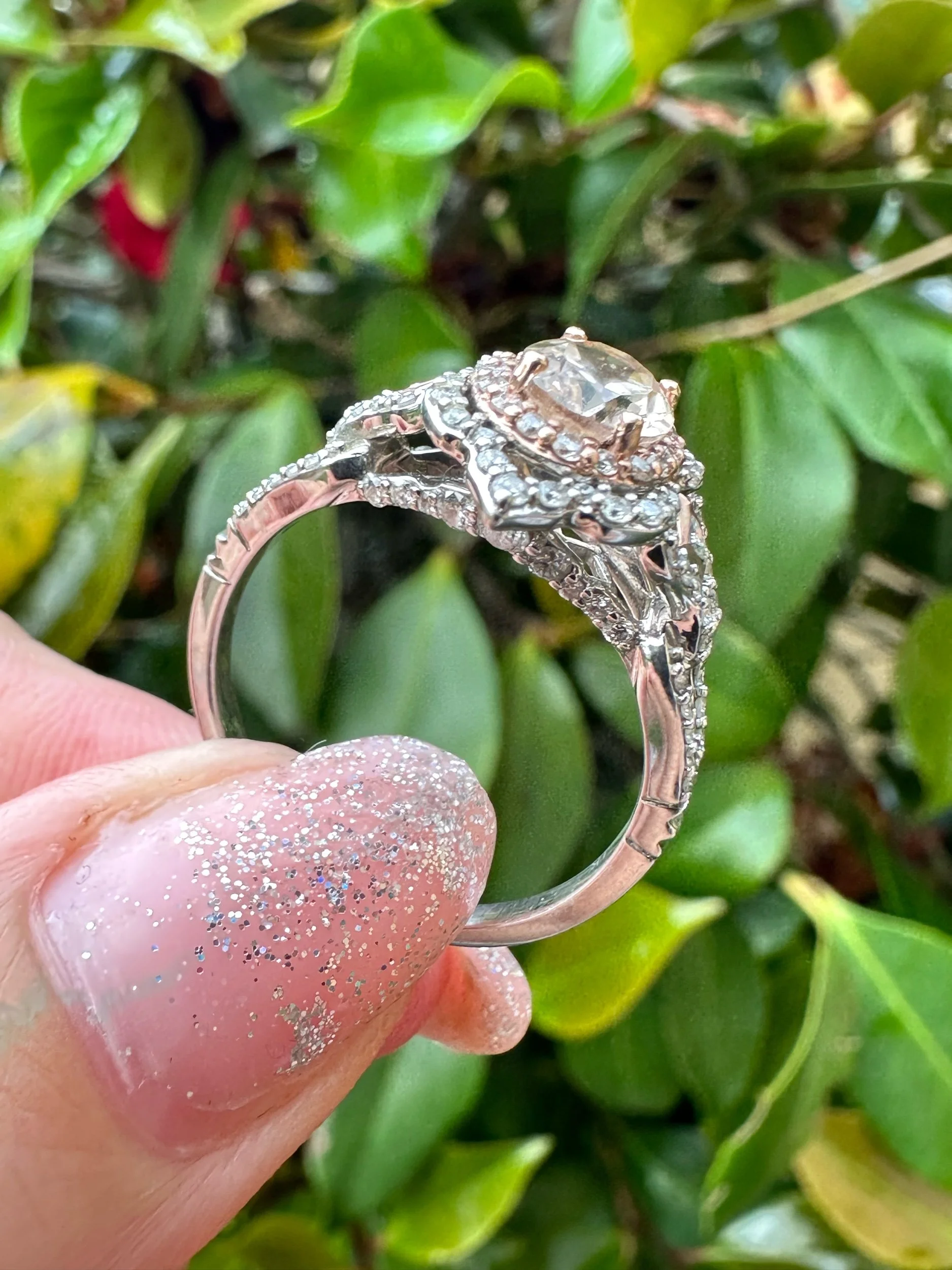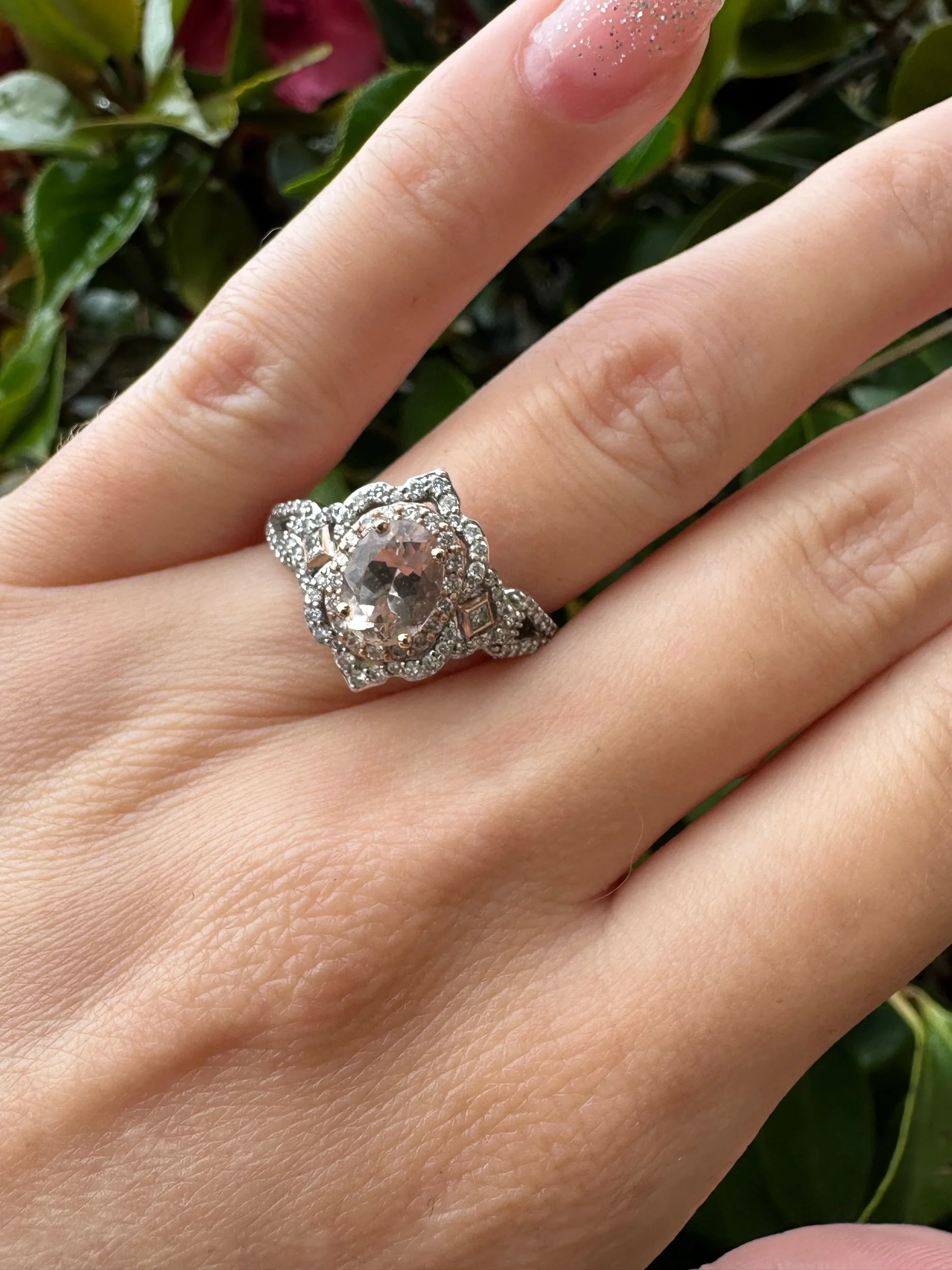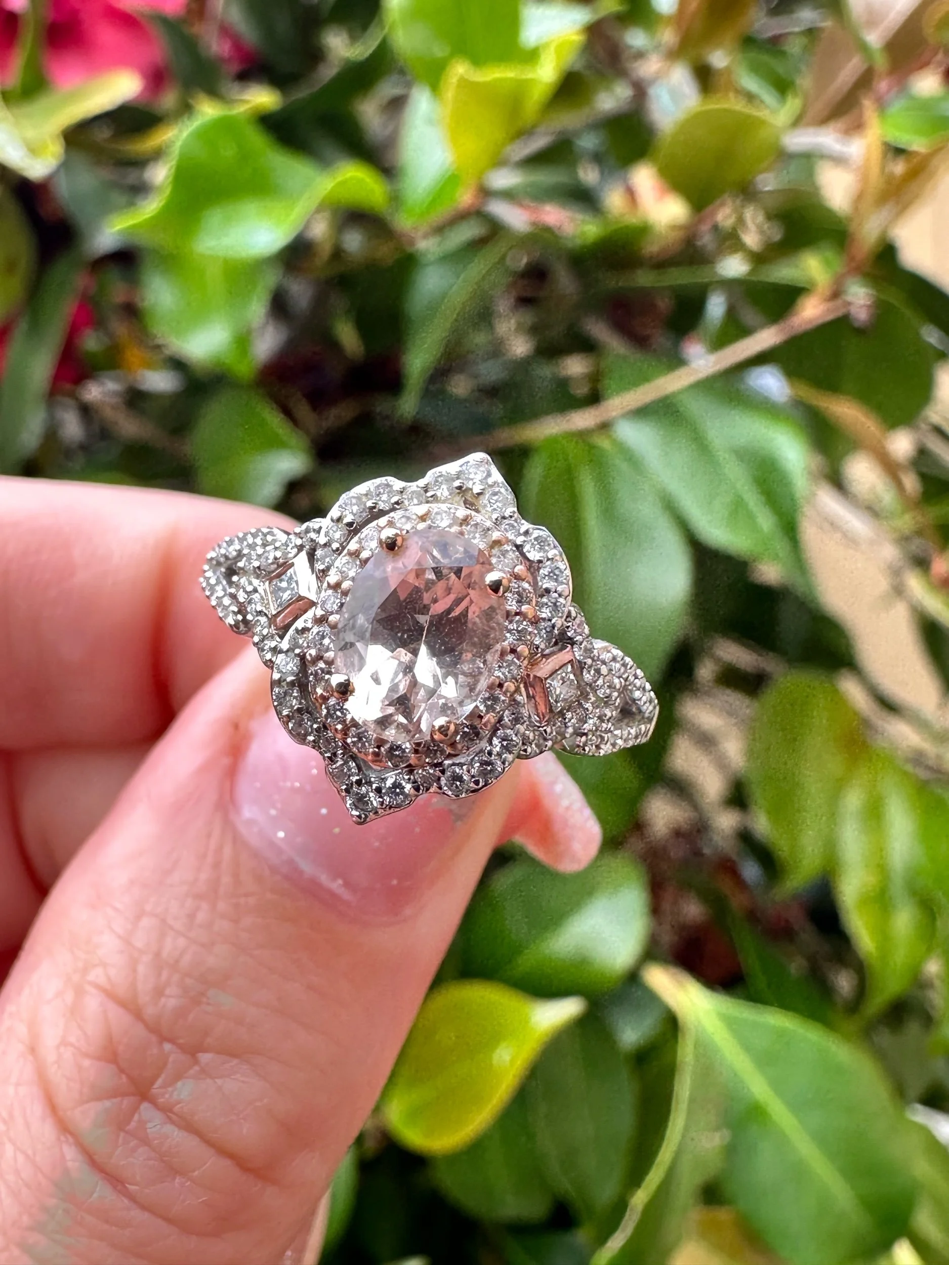 14 karat white gold and rose gold stunning morganite and diamond ring
