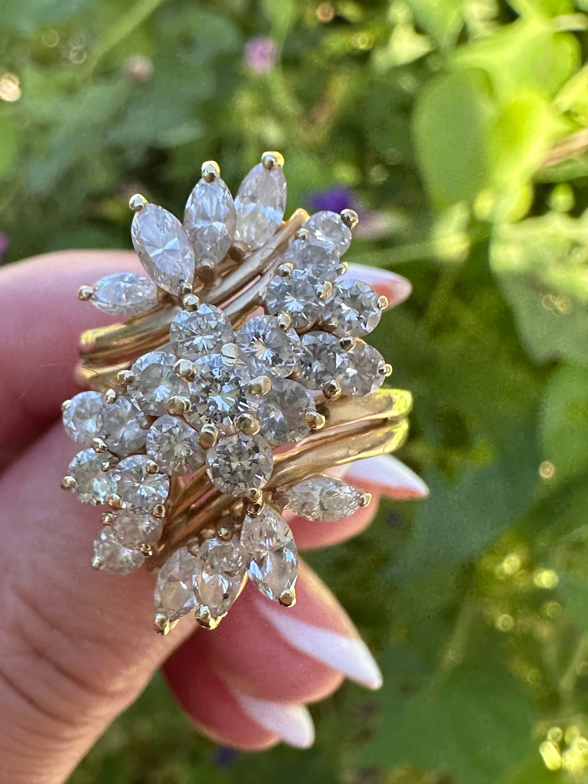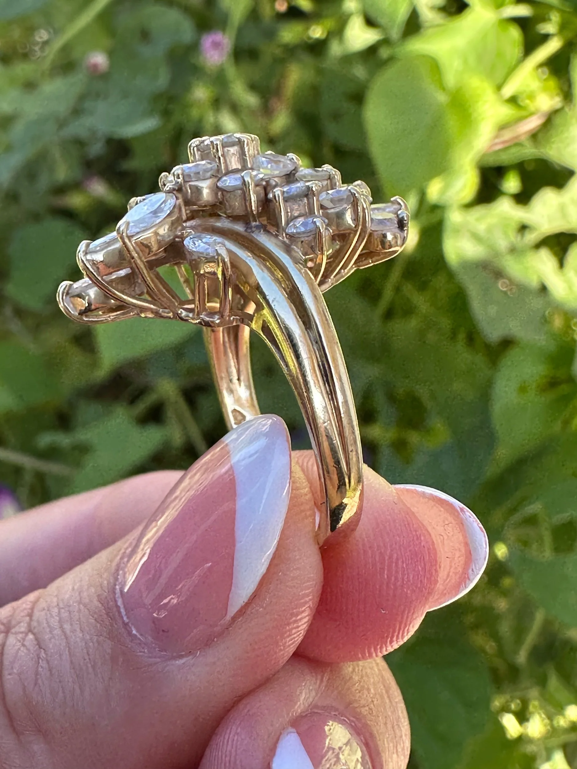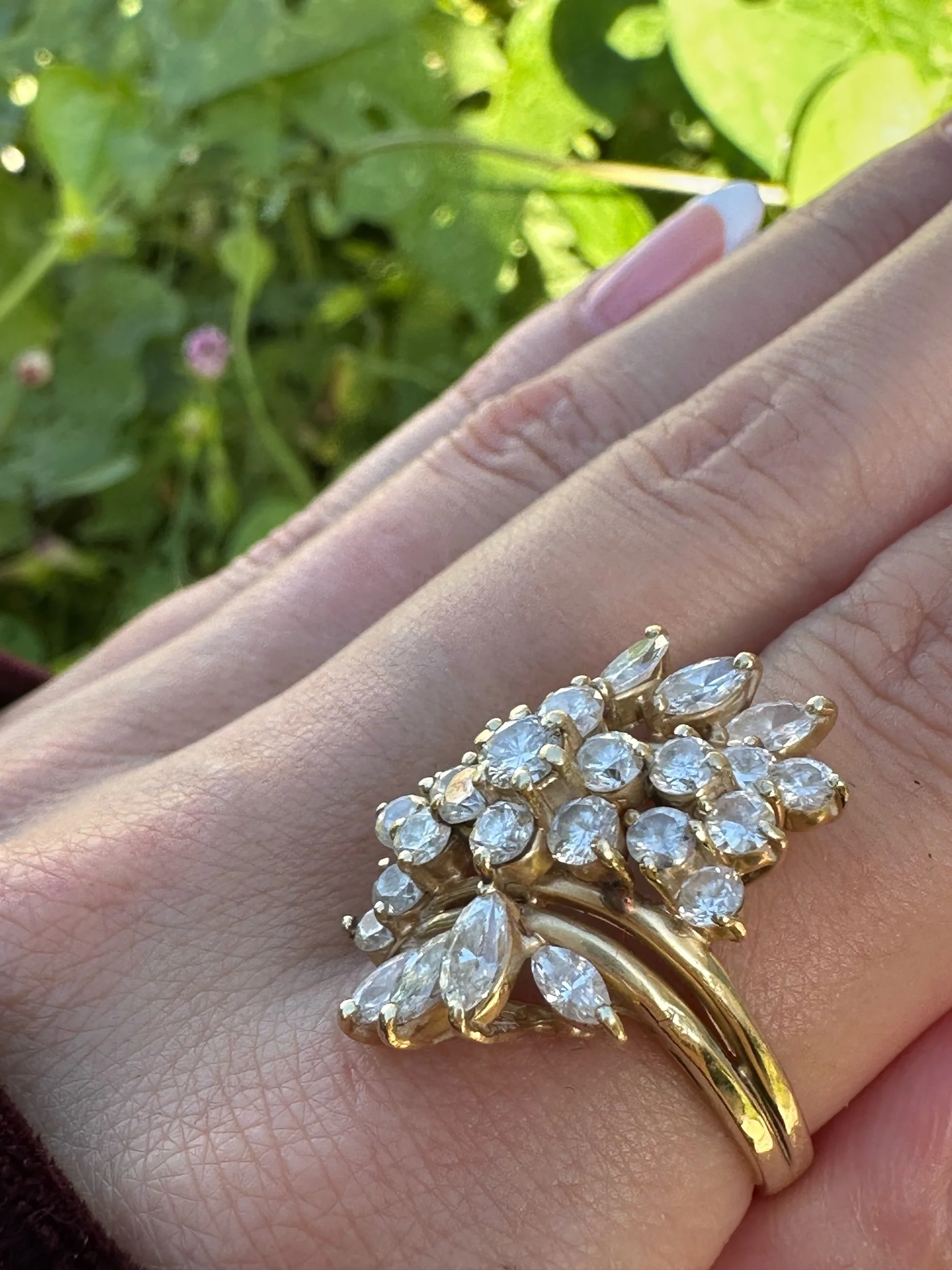 Crafted in solid 14K gold, this ring features over 3 carats of natural diamonds in a breathtaking leaf-and-floral design that wraps beautifully across the finger. It’s bold, feminine, and timeless – the kind of ring you’ll reach for every. single. day.