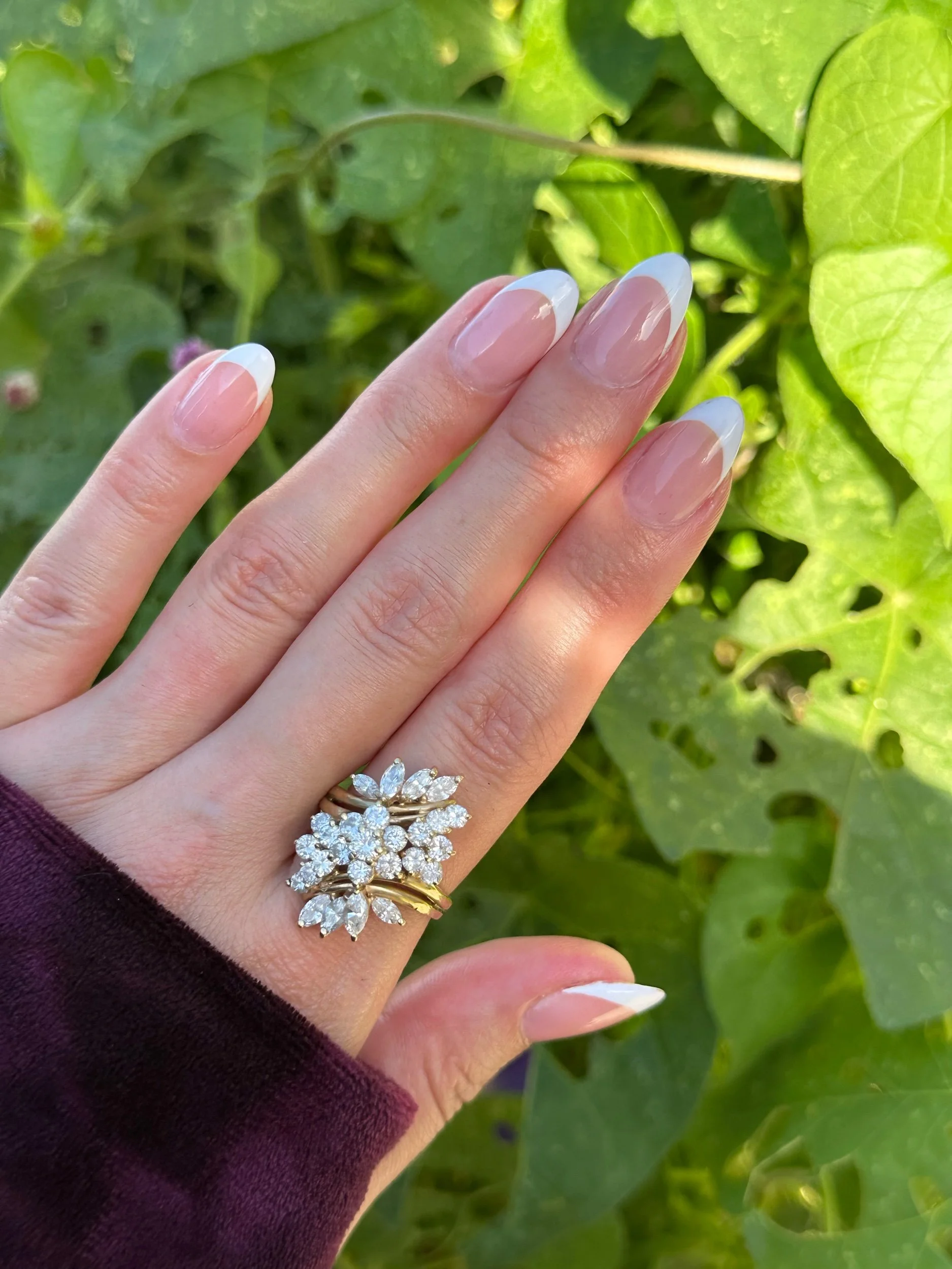 • Marquise-cut diamonds forming the leaves